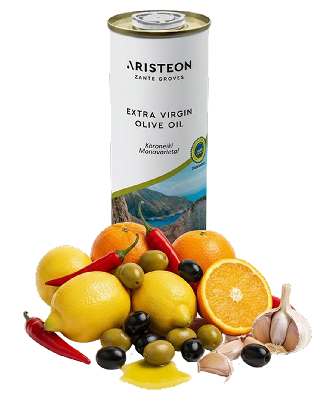 Do produkcji oliwy Aristeon wykorzystuje się wyłącznie oliwki odmiany Koroneiki, jednej z najbardziej cenionych w całej Grecji. To małe, ale wyjątkowo aromatyczne owoce, które dojrzewają w pełnym słońcu Zakynthos i zawierają wysoki poziom polifenoli oraz niską kwasowość, dzięki czemu dają oliwę o intensywnym, zrównoważonym smaku. Odmiana Koroneiki jest nazywana „królową greckich oliwek”.